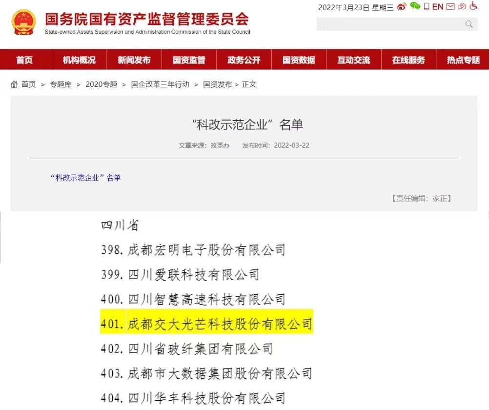 3月22日,交大光芒作為四川省七家入選企業(yè)之一,被國務(wù)院國資委納入“科改示范行動”企業(yè),此次“入選”,是繼2021年入選四川省國資委“天府國企綜合改革行動”企業(yè)的又一重大突破,也是省屬科技型企業(yè)中為數(shù)不多的“雙入選企業(yè)”,給公司深化改革、自主創(chuàng)新、跨越發(fā)展再添新活力。