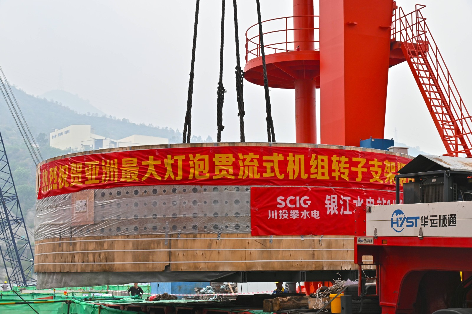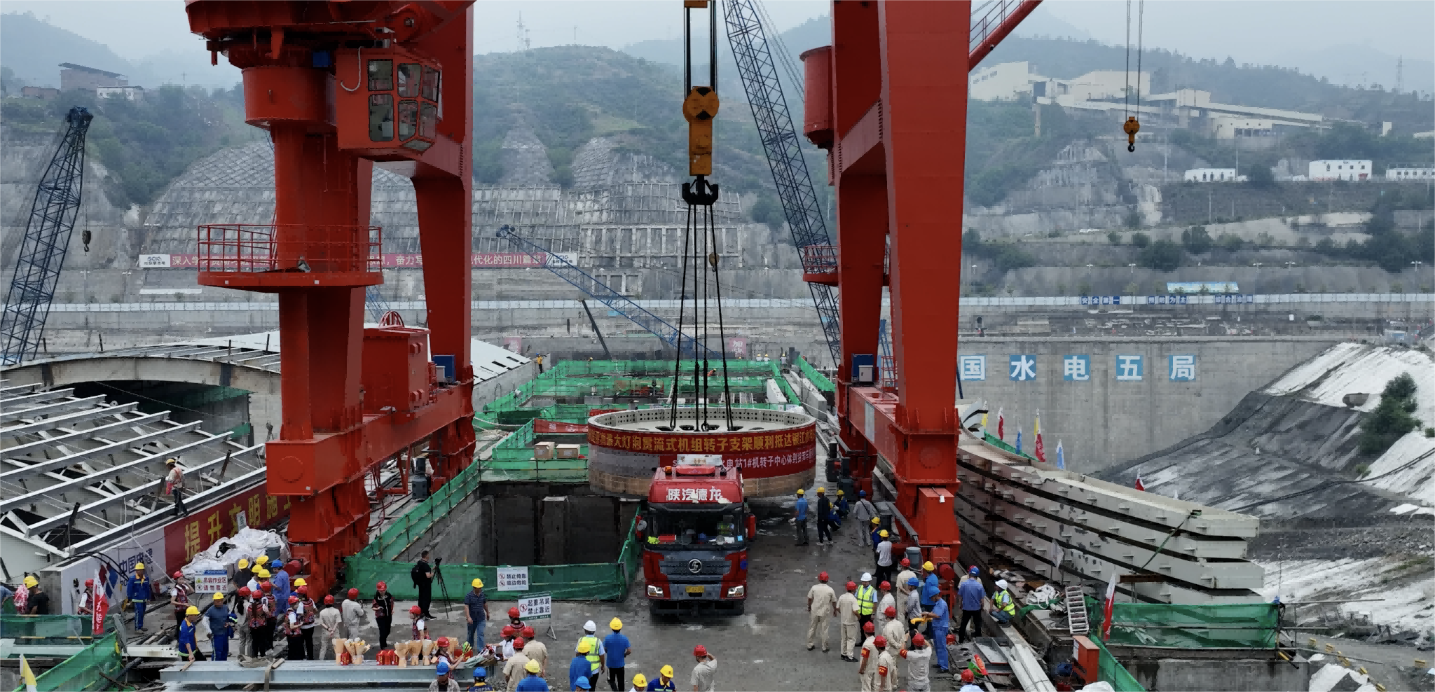 當(dāng)日上午,攀水電公司和參建單位職工齊聚壩頂,共同迎接歷經(jīng)艱難、遠(yuǎn)道而來(lái)的“重要成員”。據(jù)攀水電公司相關(guān)負(fù)責(zé)人介紹,該轉(zhuǎn)子支架具有設(shè)備巨大、運(yùn)輸困難、作用重要三個(gè)特征。設(shè)備之“重”。轉(zhuǎn)子支架直徑達(dá)8米,高2米有余,重達(dá)百余噸,是目前亞洲最大的燈泡貫流式機(jī)組轉(zhuǎn)子支架。運(yùn)輸之“難”。轉(zhuǎn)子支架于4月22日從江蘇鎮(zhèn)江碼頭開(kāi)始運(yùn)輸,先乘船再坐車(chē),途中克服了大件超寬超限、持續(xù)降雨、道路塌方等諸多不利因素,多次調(diào)整運(yùn)輸路線(xiàn),風(fēng)雨無(wú)阻,日夜兼程,歷時(shí)66天,跨越7個(gè)省份,全程3062公里,在沿途交警的護(hù)送下安全抵達(dá)。作用之“要”。轉(zhuǎn)子支架作為機(jī)組的核心部件,為磁軛一體圓盤(pán)式結(jié)構(gòu),中心體采用整圓鍛鋼與磁軛圈焊接組成,對(duì)轉(zhuǎn)子磁軛垂直度、磁軛圓度等加工精度要求極高,決定著機(jī)組的運(yùn)行性能、運(yùn)行效率和安全穩(wěn)定性。