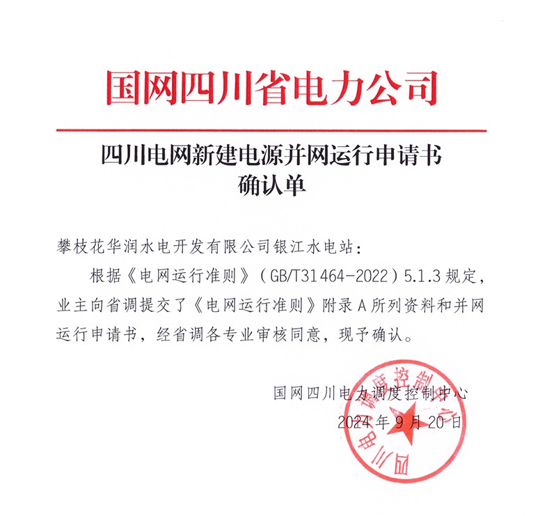 9月20日,在國網(wǎng)四川省電力公司和川投能源的指導(dǎo)幫助下,經(jīng)過積極對接、多方協(xié)調(diào),攀水電公司成功取得銀江水電站新建電源并網(wǎng)運行申請書確認(rèn)單,標(biāo)志著銀江水電站具備并網(wǎng)手續(xù)辦理的資格條件。